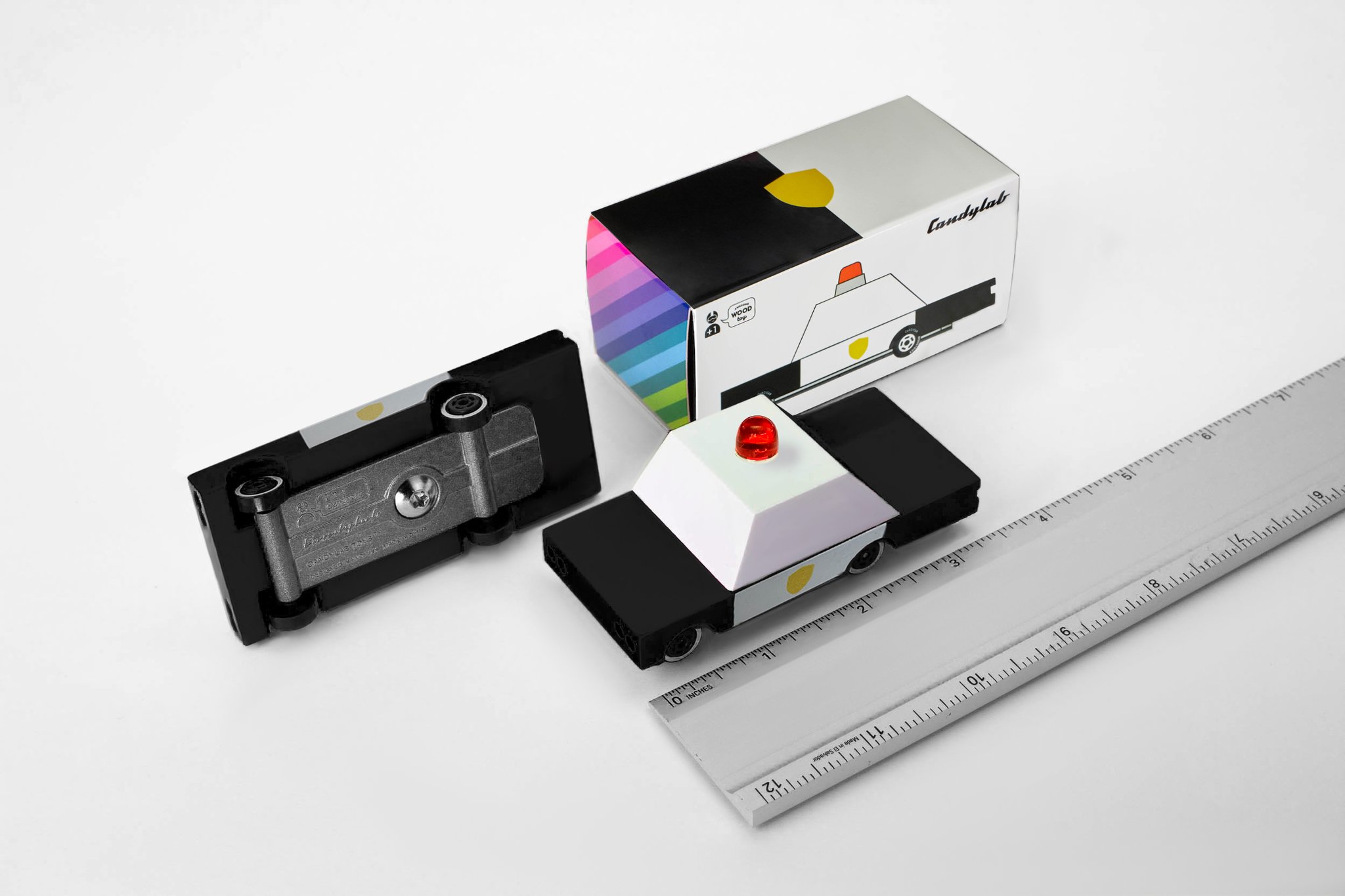 A sleek Police car, one of the most popular cars in the Candycar line, . A tiny sheriff to keep an eye on your tiny town.
