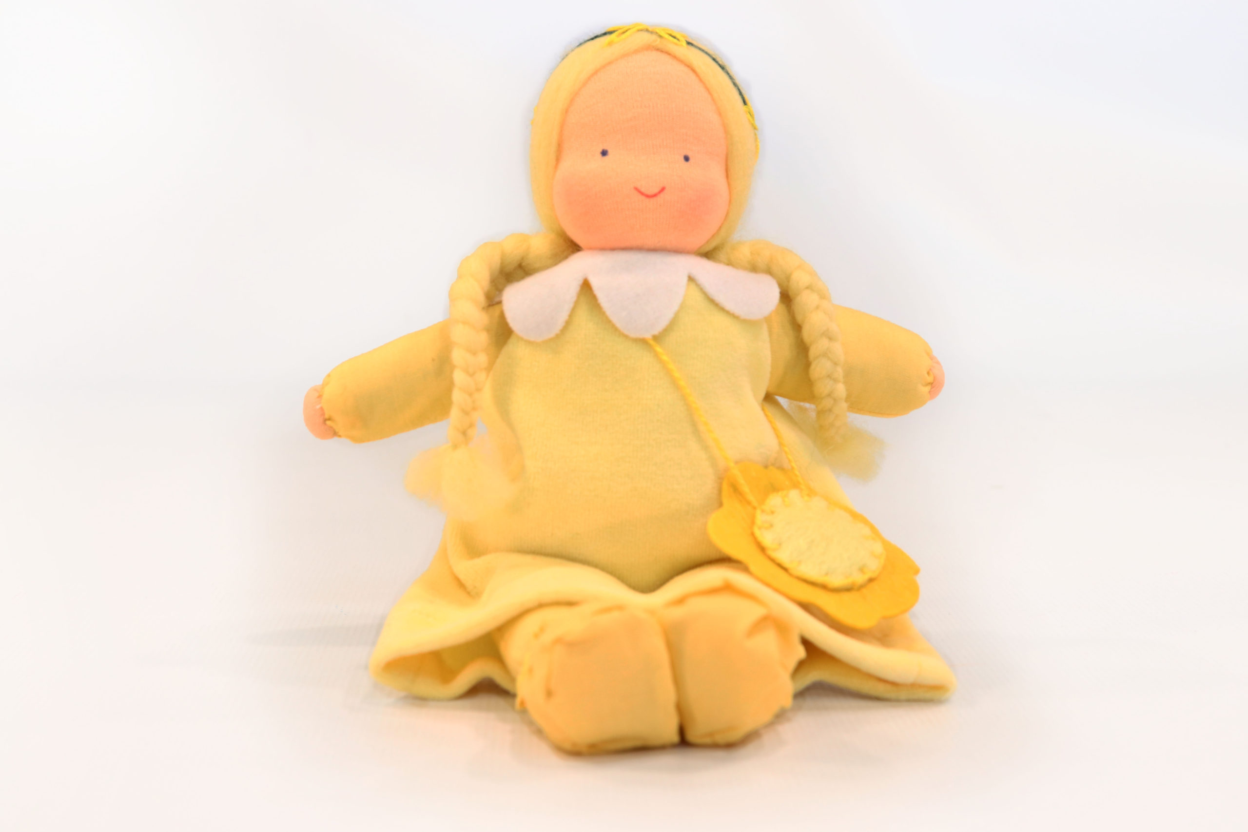 A special doll to treasure forever and enjoy childhood adventures with. These delightful dolls are made in the Waldorf tradition using natural materials including pure wool, cotton, and natural wool hair, with simple features that allow the child to imagine their own emotions and personality for their little friend. Buttercup doll is dressed in the softest cotton velour dress and carries her own little flower shaped bag padded with real lavender, her real wool hair is daintily decorated with an embroidered flower crown and she is warm and cuddly. She is a small sized fully formed doll, and expertly made to be able to easily sit to listen to stories, to join in imaginative games, and to sit and watch her human friend at play.
