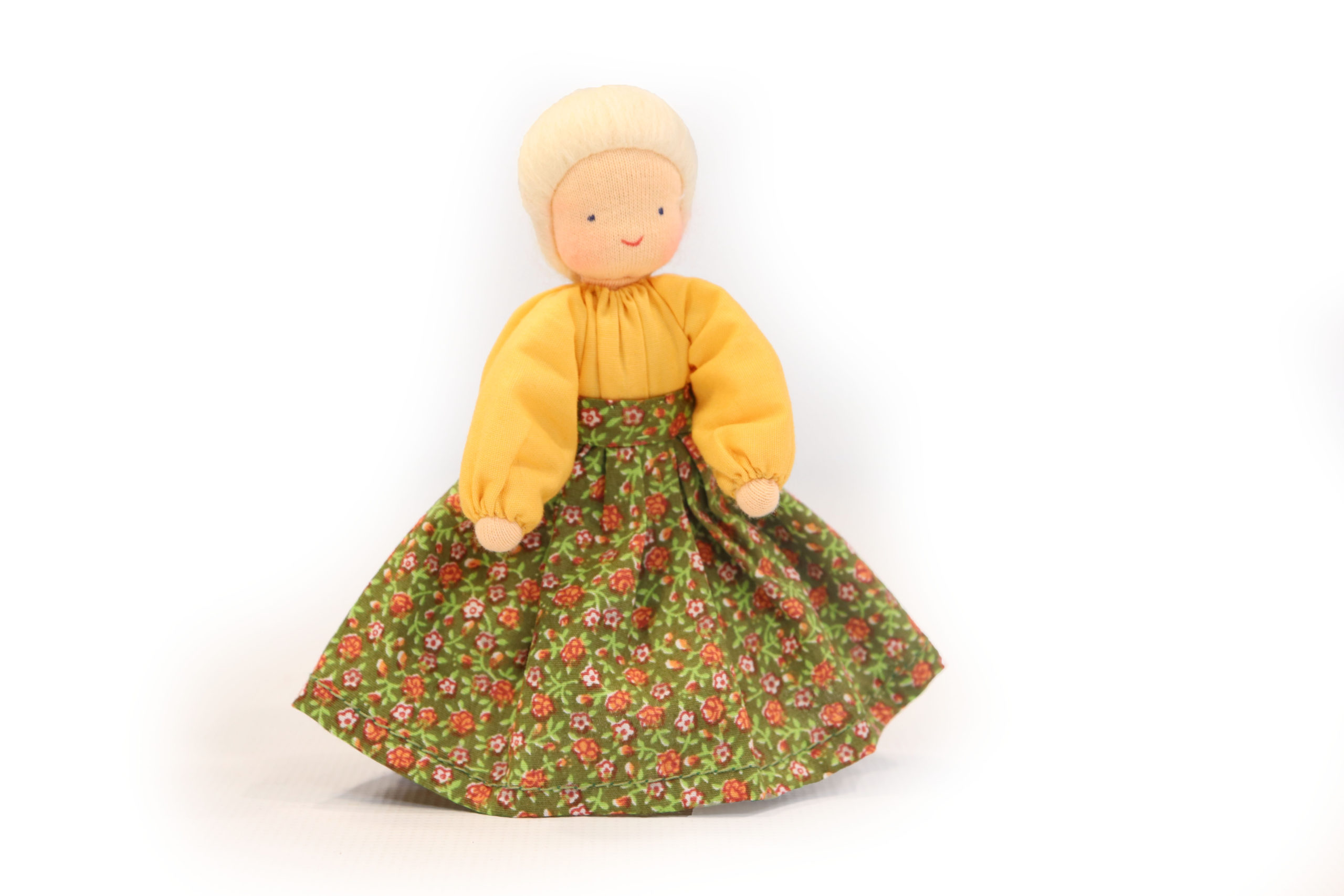 This Evi Grandmother Doll has white hair and is dressed in a blouse and skirt. Made from pure cotton fabrics and stuffed with pure wool padding, each small doll has it’s very own individual character.