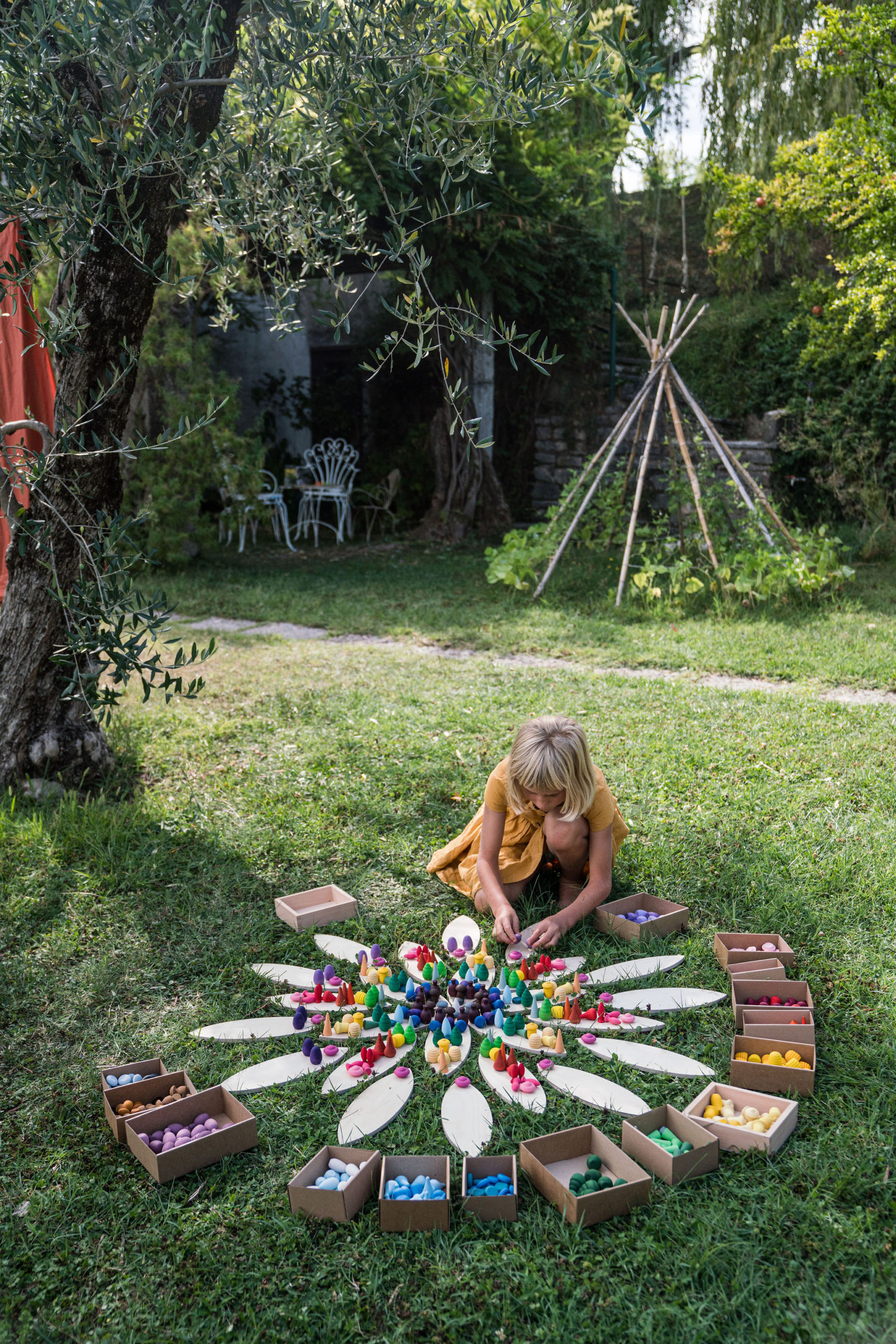 The Grapat set of natural timber petals (this is the larger set) provides a beautiful open ended play experience, a tactile tool with which to discover, experience and explore the world, through non specific play. Move, store, collect, sort and stack. Simple exploratory games that help to develop, hand eye coordination, imagination, mathematic skills and so much more. Can be used to display objects found from nature, perhaps used as a base to create patterns with Grapat mandala pieces