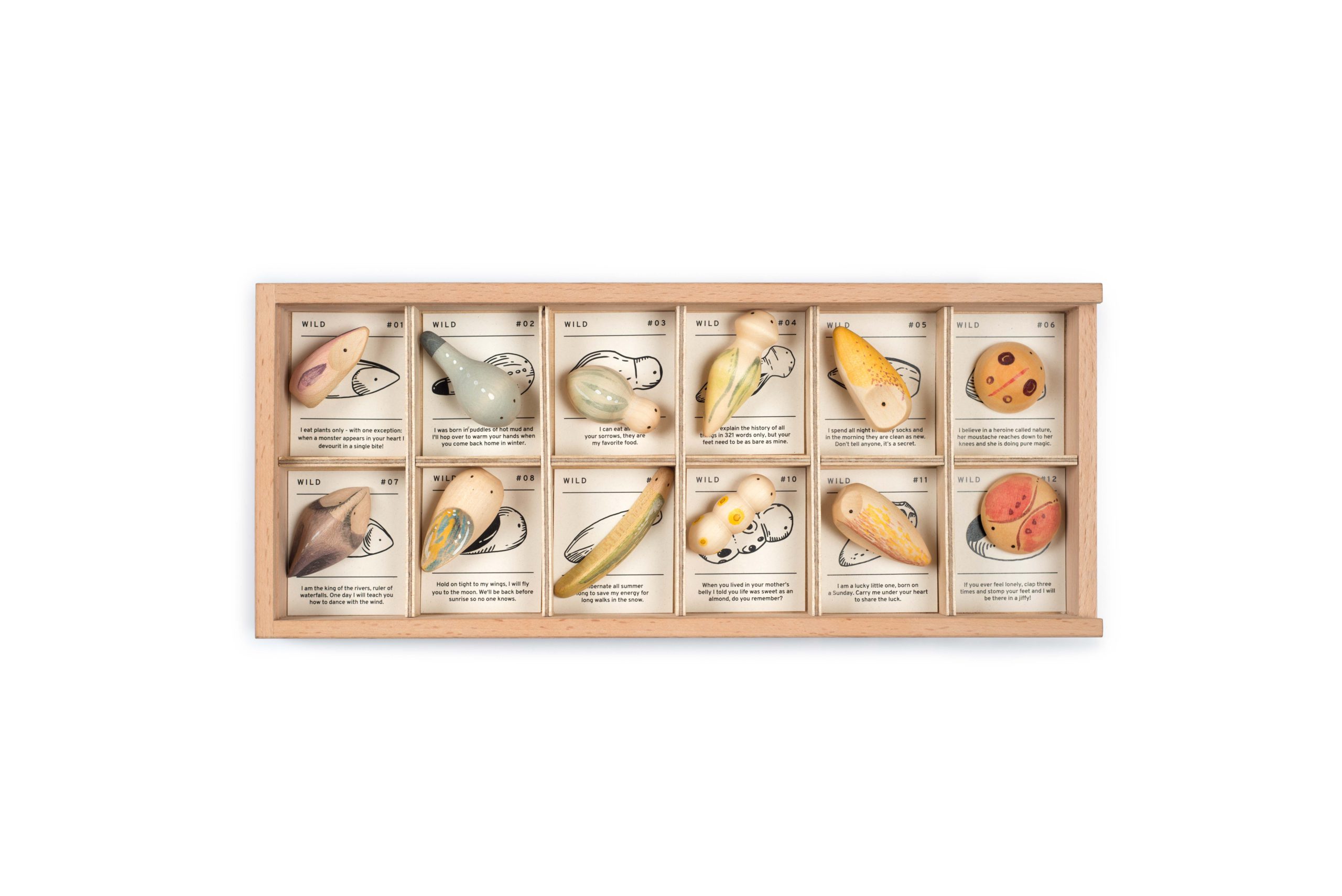 Beautifully presented in a wooden ‘specimen box’, with a little card describing and imaginary personality for each, The boxed set also makes a lovely gift for an artistic or nature loving adult.