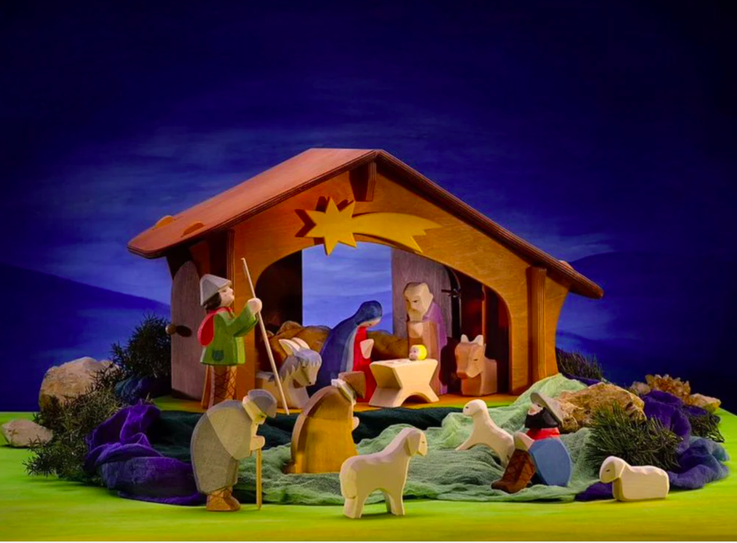This wonderful Nativity scene gift box comes complete with Mary, Joseph and baby Jesus in a crib, four shepherds; kneeling, standing, a sitting and bending postures; a sheep with 2 lambs, and a wooden stable to easily assemble, with a star fixed above the entrance. All items are handmade with care and hand painted by Ostheimer’s experienced aritisans, treated with non toxic colours and natural organic plant based oils. Beautifully presented, the pieces are safely nestled in clean straw, and housed within a sturdy, handcrafted box that features a sliding lid for easy storage & retrieval.
