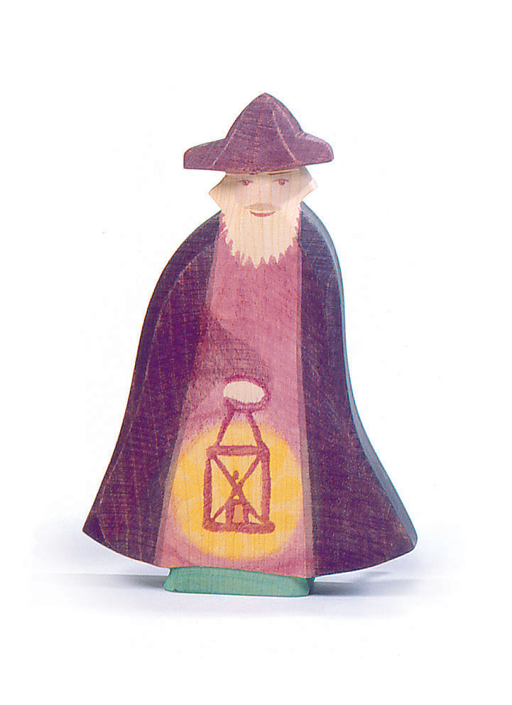 This charming old gent is charged with night watch duties in the Ostheimer toys fairytale realm; perhaps patrolling the cobbled streets with his lantern to make sure the inhabitants are safe. If he senses danger he would sound his horn (painted on his back).