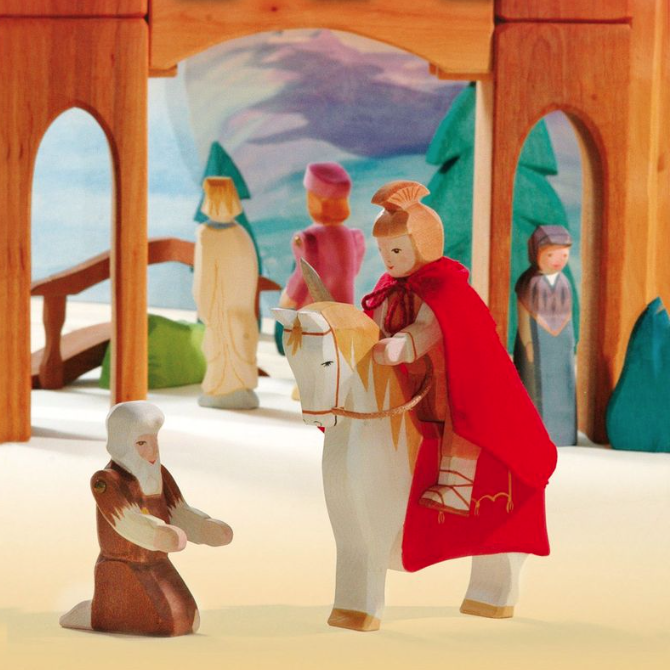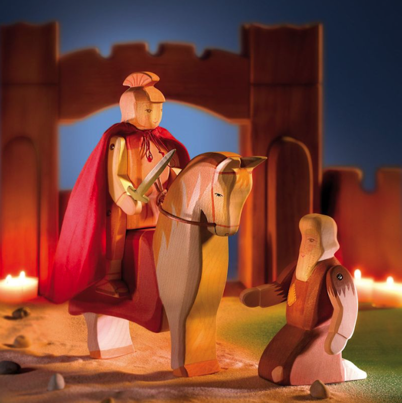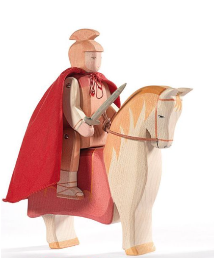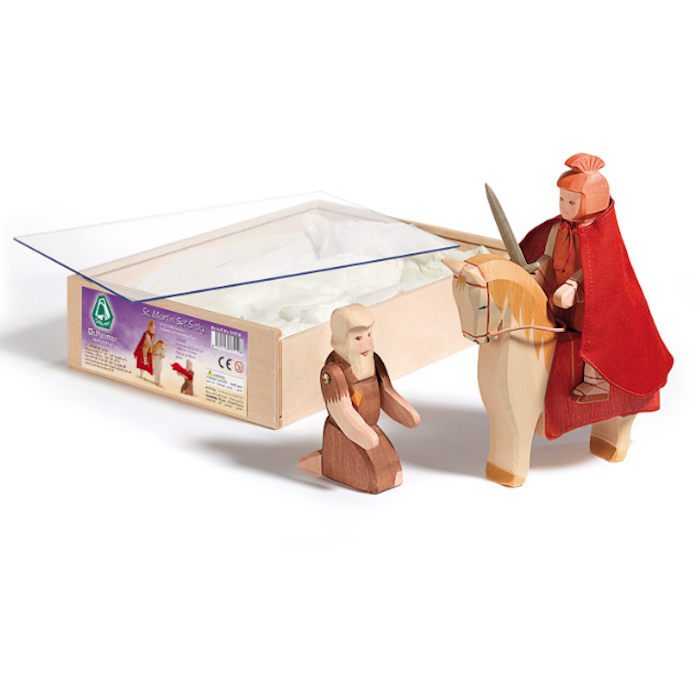 Saint Martins Roman soldiers attire and decorative horse blanket are so regal that some children include them in castle play. The story of St Martin can be told with St Martins red cloak becoming two pieces (cleverly joined with velcro) to enable him to give half to the beggar.
