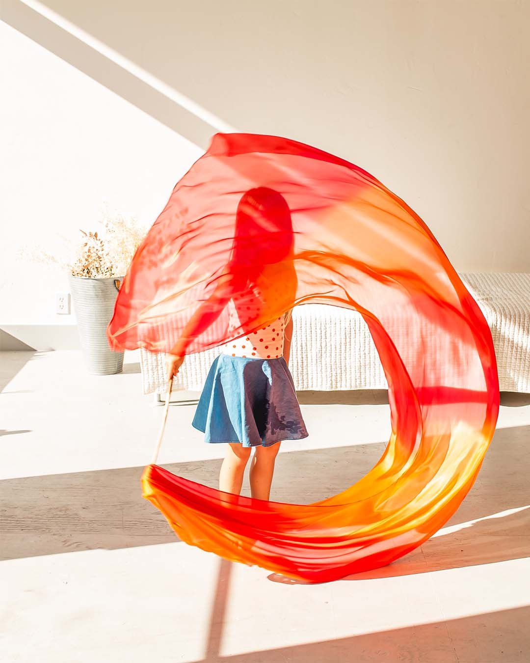 Sarah’s Silks Giant fire playsilk, is a beautiful blend of firery reds and oranges.