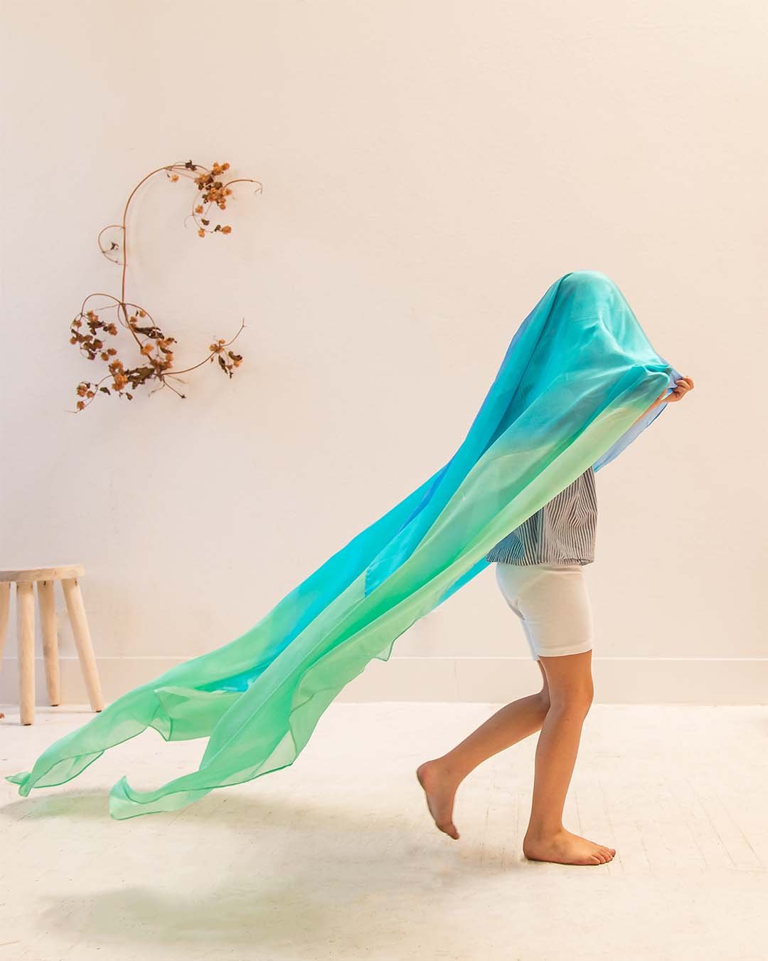 Sarah’s Silks Giant Playsilks are perfect for draping over play stands, creating puppet theatres, making bed canopies, hanging across a window to diffuse light, or setting up as a play background. The generous size and feel of these giant multi coloured silks, encourage open-ended play, your child will love incorporating them into make-believe scenes, cubby building and physical activities like yoga, dancing, and sensory play.