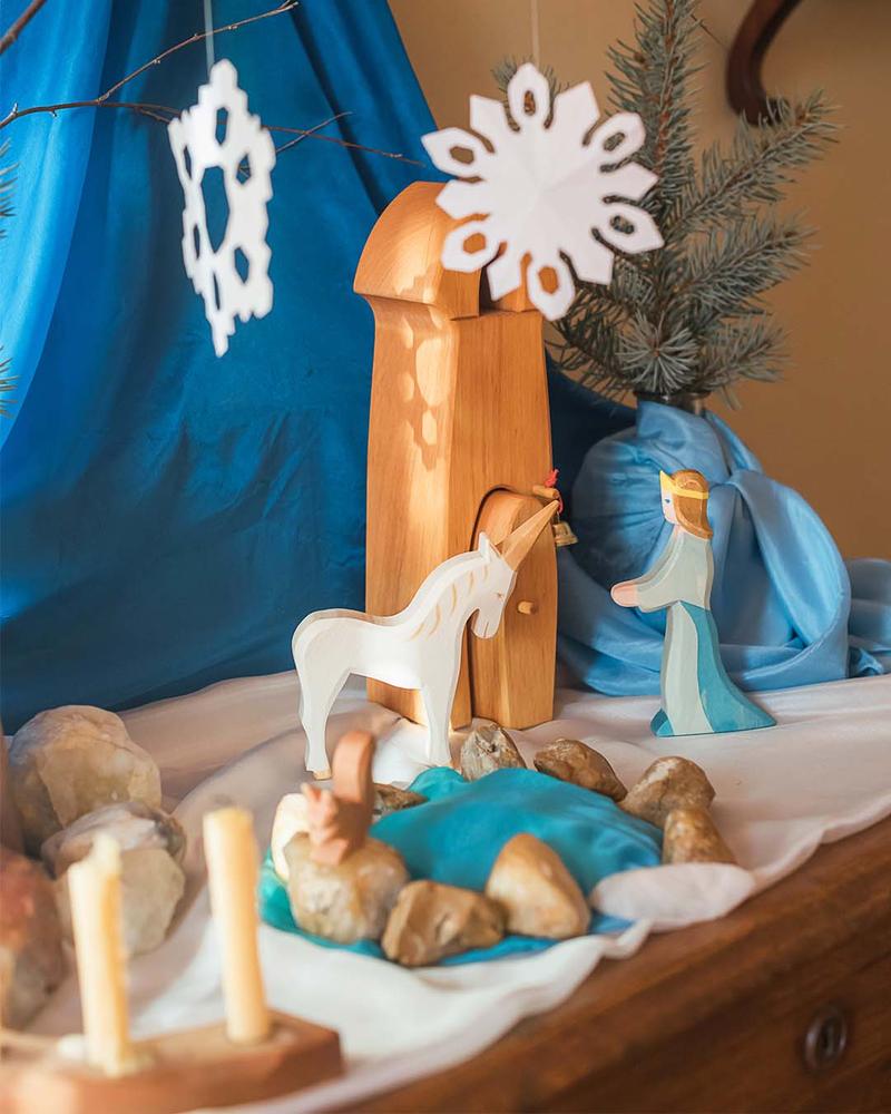 Some children make costumes like capes, skirts, pants, hats, veils, animal tails and more. The next day the same silks become green grass for their toy animals to live on, blue water to sail the boats, or a rainbow can appear in the sky above them. Many children wrap their dolls in them or tie them on as a sling to carry a favourite animal or doll around in. They can be used to build forts with the sofa cushions, for a puppet show curtain, and for magic tricks.