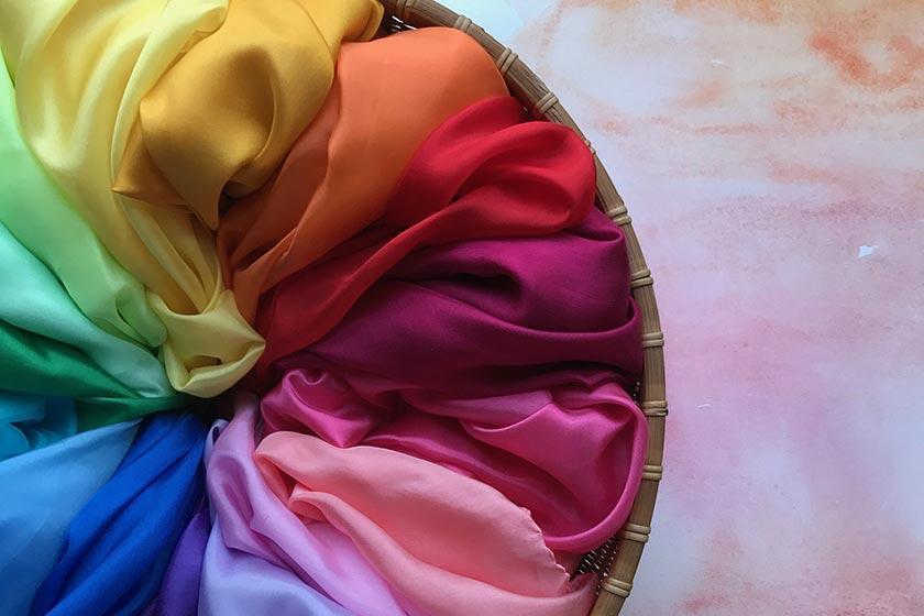 A basket of coloured playsilks is one of the best additions to a child’s playroom. It is amazing to see what children create with them.